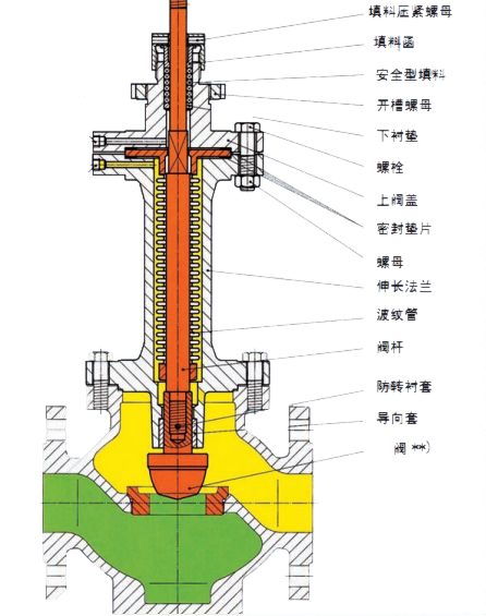 氣動波紋管密封調節閥就是在密封元件外面加了一層保護膜,防止帶腐蝕性的介質直接接觸密封元件,而且在介質壓力增大時,波紋管隨之伸長,降低介質對密封面造成沖擊,在腐蝕性很強的介質工況下,還可以采用雙波紋管結構密封。